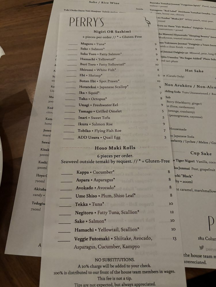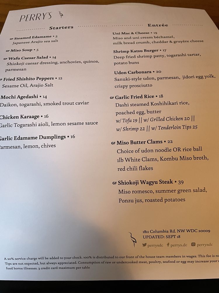 Introducing the menu at Perry's Restaurant, a Japanese Sushi Bar located in Washington, DC. With a wide array of options, including Hoso Maki Rolls like Aspara Maki and Negitoro Maki, Nigiri/Sashimi choices such as Botan Ebi and Tamago, and Ura Maki Rolls like Dragon Roll and Crunchy Tiger Maki, there is something for every sushi lover. Customers rave about the fresh and tasty sushi, flavorful dishes like Wagyu Roast Beef Salad, and unique cocktails like Kobe Passionfire. The ambiance can get lively as the restaurant fills up, but the friendly and attentive staff make the dining experience enjoyable. Don't miss out on the must-try dishes like Udon Carbonara and the ice cream sandwich dessert. Perry's Restaurant is a trendy spot perfect for groups, date nights, or casual dining. Visit Perry's for a delicious and memorable sushi experience.